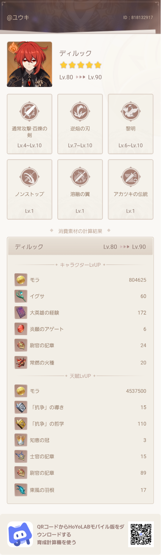 藍鼠 @admin ホヨ公式ツール、キャラ育成用の素材合計見られるようになってるうえに画像DLできるんだね ゲーム情報連動させられるから現時点からの素材数がわかる。便利 うちのエースアタッカー。ディルックの旦那の見たけどいや多いな……80→90の最終段階でこれ 爆炎樹さんは比較的楽とはいえ、いまの世界レベルだと一回につきコア2個だよ。10周はしてね☆ ルビーみたいなほうも爆炎樹さんドロップだとおもうけど見たことない。合成?いま世界レベル下げてて5だから戻せば確率上がるのかな 徽章も地味にめんどい。ファデュイがまずめんどいので相手したくない 敵強化されるから、全体的に戦力強化してからじゃないとぜったいめんどうくさい。私は気楽にあのマップをフラフラしてストーリー見たいんだよぉ #原神