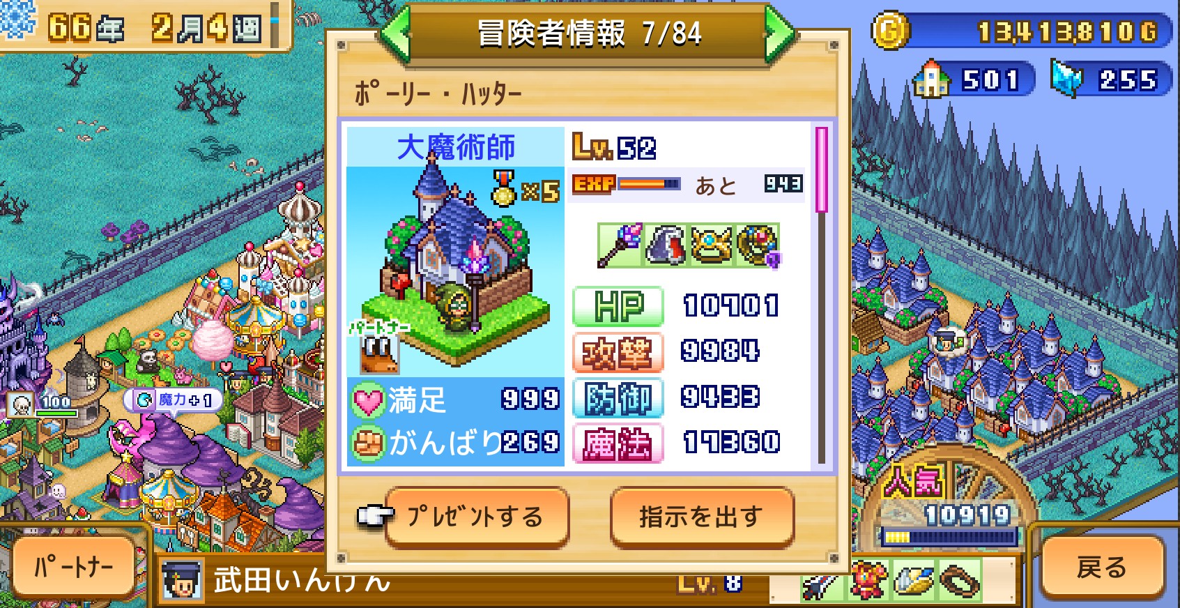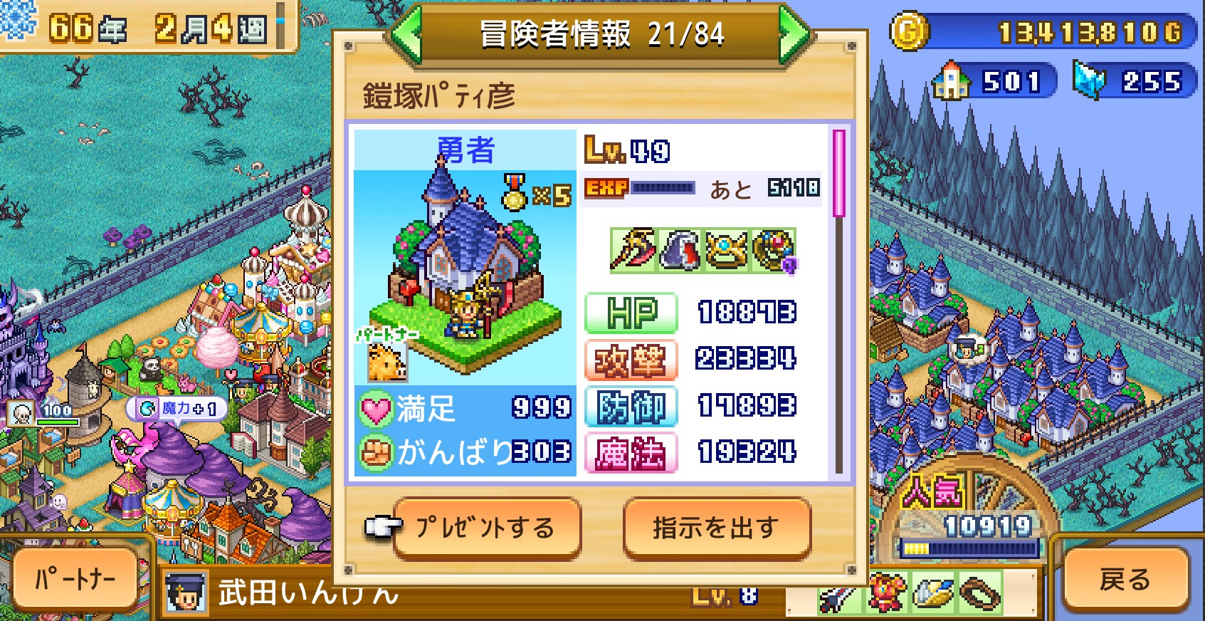 藍鼠 @admin #カイロソフト ダンジョン村2、全ステージクリアしました。66年目、1月完 いや~~~めちゃくちゃ堪能してしまった 前作のダンジョン村に出てきた冒険者は2にも全員出てくるのかと思いきや全員ではなかった…真弓さん(くん?)とか来てくれると思ってたのに あと六本木麗子さん。彼女もいると思ってたからもしかして人気度足りてないのでは?と攻略サイト見に行ったらやっぱり出てこないみたい。てか冒険者106人もいたのか ステージもめっちゃあったね。草原、森林、南国、雪国、魔法、和風、魔界。和風が好きかな~でも周辺住人含めると最初の草原が一番好きかも 実績コンプしたのは和風ステージだったけど、その次の魔界まで遊んだしちょこちょこ過去ステージに戻って周辺住人のノルマ全達成までやりました。街検定は放置した 魔界ステージのラスボス、さすがのラスボスな硬さだったけど氷と闇を同時に被弾したっぽい太郎とパティ彦(メイン戦力)が凍ったまま動かなくなっちゃって一旦クエスト諦め、延々と凍ったままだったから焦ったよ……オートセーブあるとはいえ、どのタイミングでされてるのかわからないし手動セーブいつしたのか覚えてない 幸い他のステージに移動で解除されてくれたのでほんとよかったw ボスは和風ステージにいた狐が好き。ボスは見た目かっこいいのにどっか抜けてて愛嬌あるのが良いですね 和風ステージといえば、これはひどい……となったリザルト画面(思わずスクショした) エリアレベルが進んでいくと雑魚敵の一撃でもだいたいの冒険者が沈むので、古参も参戦させたうえで見守ってたんだけど案の定死屍累々、大司祭だったカゲトラの詠唱がめちゃくちゃ速くて誰かを蘇生してるっぽいけど誰を蘇生してるのか謎→攻撃魔法の全体化発動してノルマの10体全部仕留めてたのテンション上がったあとでこれだよwww たぶん敵の攻撃タイミングとぴったりだったせいでゾンビ戦法させられることに(ただし一撃も与えてない) ヒット数3桁を初めて見た記念。なおラスボス クエストとして受けられる(参加できる)の9人までだけど、村の入り口付近で発生してくれたからか、みんな寄ってきて参戦しててラストバトルとしてよかったな~ クリア時のお気に入りキャラステータス。インフレが激しいw カゲトラは忍者に戻そうか迷ったものの、メカクレのところが気に入った+氷属性の剣持っててほしい+似合う衣装が合わさって貴族。でもたぶん貴族は剣好みじゃない