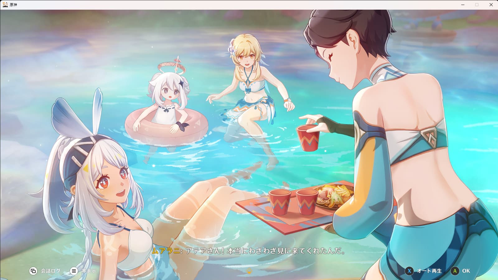 藍鼠 @admin #原神 そういえばナタ編、ムアラニに案内された彼女の部族で旅人(とパイモン)が水着に着替えてたの新鮮だった てっきり暗転+文字で済まされるんだろうな…って思ったのにお着替え!した!! 可愛い。髪ツインテールにしてるパイモンもかわいいね 水着で温泉♨️よいイベントでした