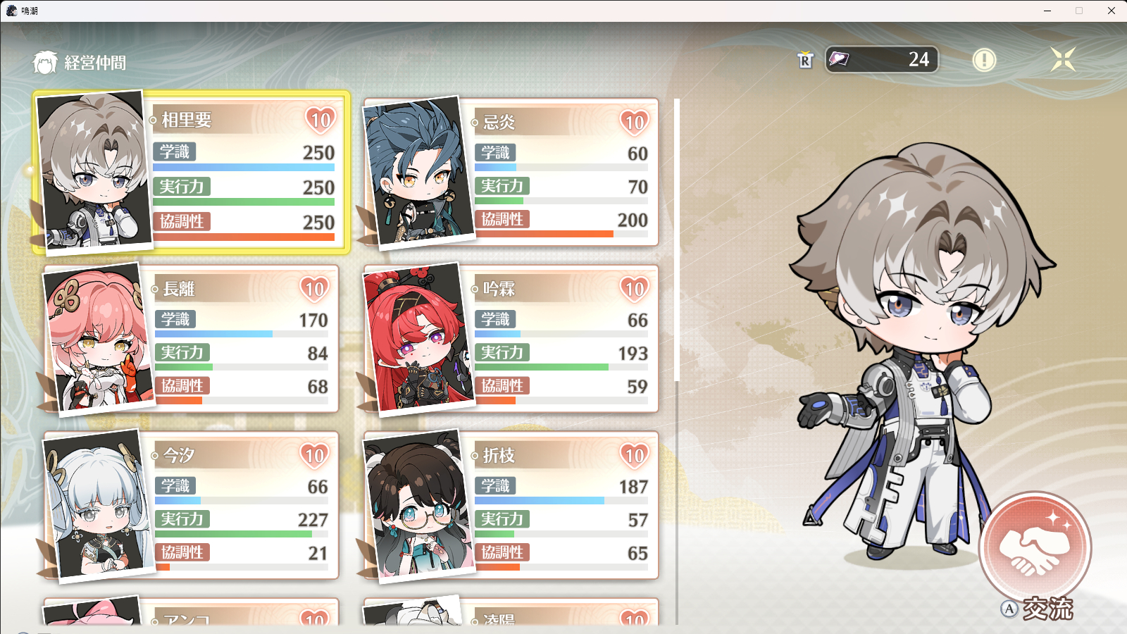 運営資金がべらぼうに余ったので相里と交流しまくってステータス全部MAXにしてやった。なお最後に残ってた「満足度SSを12個取る」ノルマ終わった後だったので使う予定はないもよう