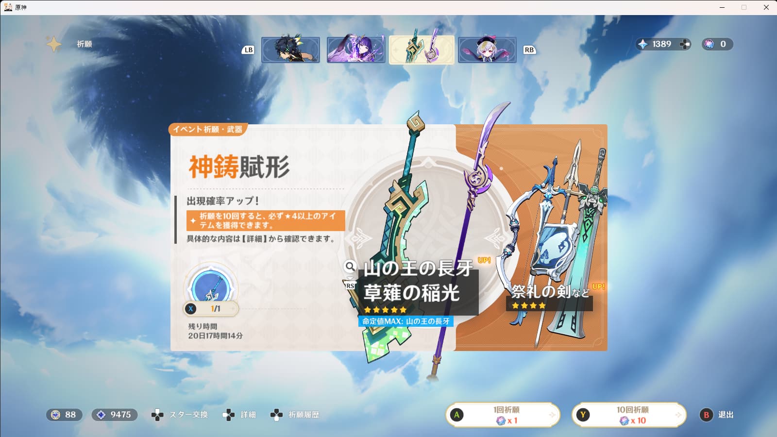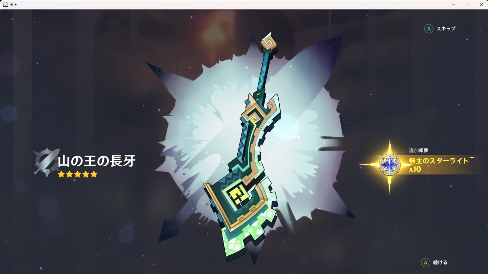 藍鼠 @admin #原神 モチーフ武器はテンション上がるよな!ということで武器も引いた。メインストーリーで炎神様に貸してたのも良いですね 早めに来た!と思ったら雷電将軍の槍(長刀)で「アレ!?選び間違えたか…?」と不安になって確認しちゃったよ。選んでない方もでるのね ナヒーダ用の石はさっぱりなくなりましたが、なにまた溜めればいいさ。