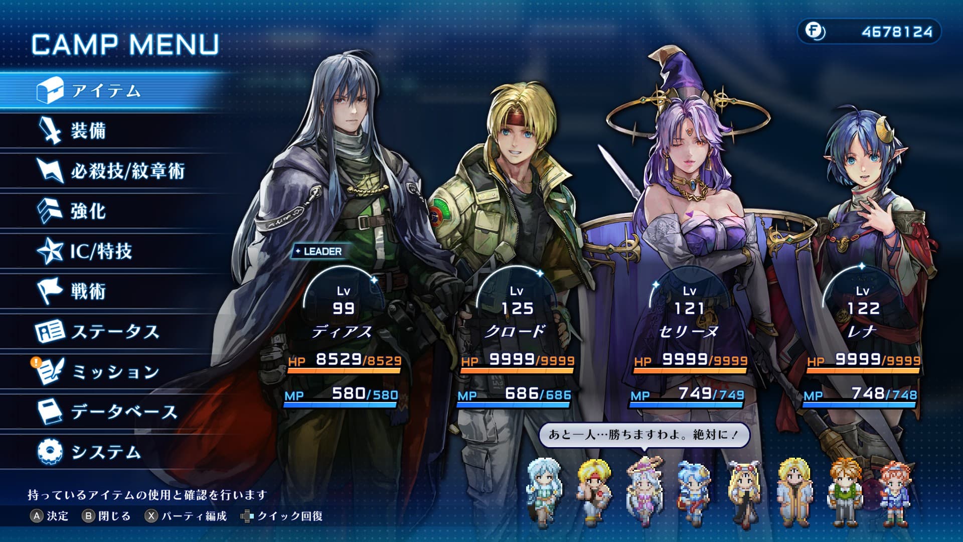 藍鼠 @admin #SO2R レナ編もエンディングまで到達! タイトル画面の真ん中にある光は最初なかった気がする チサト、ディアス、ボーマン先生はソロエンド ディアスほんと丸くなったなあ…セシルのお墓参りしてるときの話し方が柔らかい そういえば古文書の解読依頼してたね(ボーマンエンドに出てくるキース教授で思い出した)……解読されたんですね!!いま!!??本編中じゃないんだ 古代人の神話、ネーデの物語だったのか。十賢者の話も出てきてるかもね オペラとエルネストはペアエンド。ちょっと安心したよw 夢を追うエルネストに根気よく付き合えるオペラすごいと思う。PAとかあんまり見られなかったのと戦闘もアペンド参戦くらいでほぼ触れられなかった…十賢者の目玉いっぱいついてる人が彼らの種族に触れてたの細かいなって思ってました。そこで地球とは別の星出身なのが確定した セリーヌはクリス王子とのペアエンド。ゆくゆくは王妃様になる?というかなってた!! 「王妃としての務めもあるのだから、秋の収穫祭までには帰ってきてくれよ」 セリーヌの冒険心を許容して快く送り出してくれる王様すげえ……個人的には王妃様のお仕事頑張ってほしいけどな~~ レナとクロードペアエンド。ここは、うん。調整しない限り固定だと思う レナ編だからなのかアーリア村での光景でした。地球には帰らず、アーリアで暮らすクロード。最終決戦前に言ってた「レナに伝えたい大事なこと」は伝えられたんですよね?最終決戦前のクロレナは両ルート共通だったけど、そこんとこ触れられなかったよなあ レナ編エンドでのクロレナはくっついてんの?クロード編での「パパになるのに」が衝撃すぎて…あっちは地球帰ったうえで宇宙にも出てるのかなって思った またガブ戦前にスクショ忘れてたから撮ってきた最終メンバー