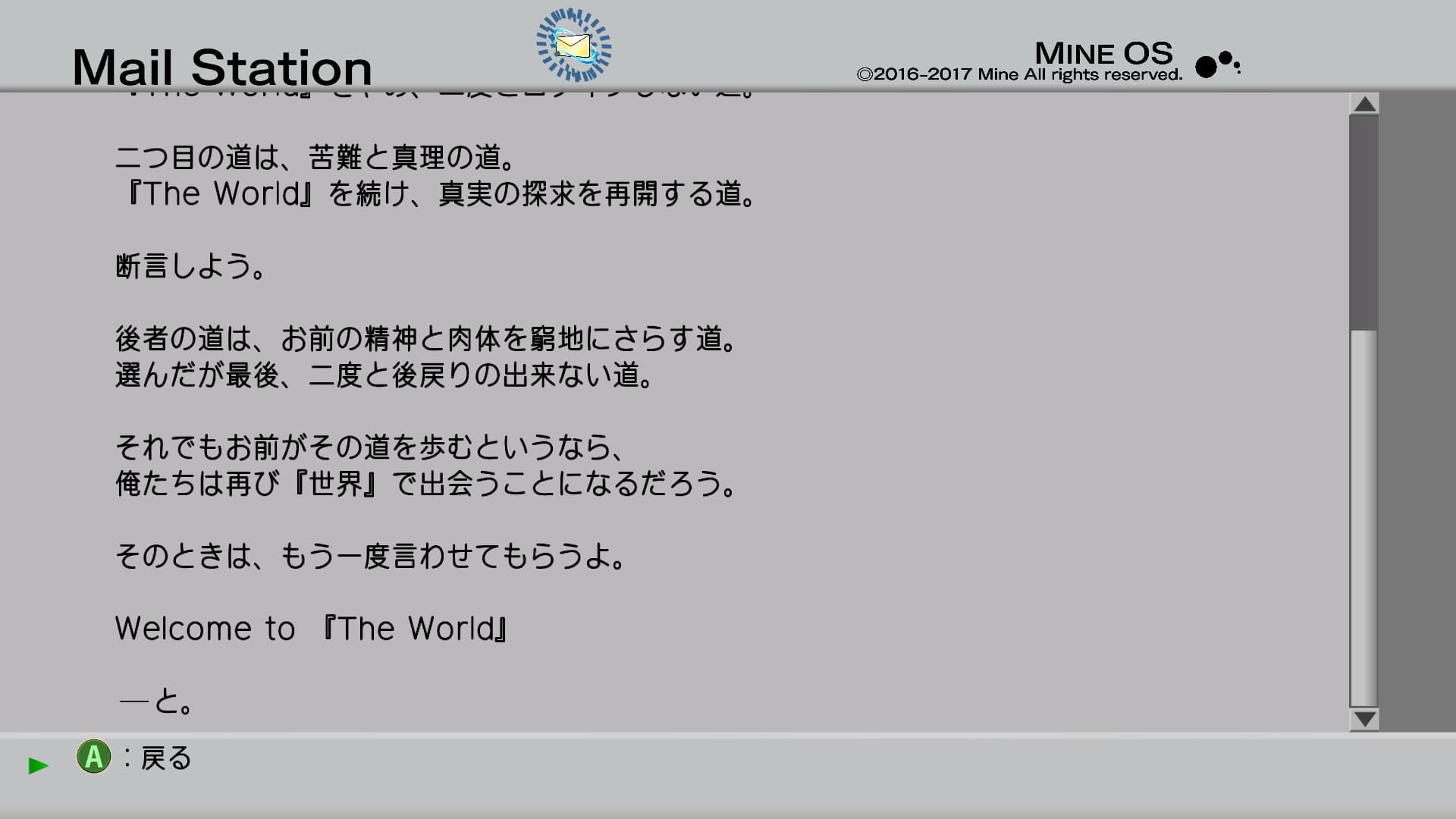 藍鼠 @admin #.hack//G.U. いや…ムービーなっげえよ!! え、こんな長かった?w オーヴァンの「Welcome to 『The World』」(英語だった)からハセヲがデータドレインされるまでずーっとムービー おおよそ主人公がしていい言動&顔ではない 当時はメディアミックスと前もって言われてたけど今見ると『8ヶ月後』にいきなりすっ飛ばされるの不親切極まりないw 空白の8ヶ月は.hack//Rootsをよろしくね!だもんね… ハセヲさん8ヶ月で2ndナンチャラ(フォームチェンジ)終わらせてたのか 「この半年間なにしてた!」とオーヴァンに聞いてるから、『ようこそ』されたあと黄昏の旅団入る→オーヴァン行方不明(半年前)→志乃が『三爪痕(トライエッジ)』にPKされる→ソロでトライエッジ探してPKK死の恐怖になる→オーヴァンと再会→グリーマ・レーヴ大聖堂でデータドレイン 濃い日常すぎる オーヴァンの「仕込みがあるんでな」を今見るとオーヴァンこのやろうwと思います でもトライエッジのデータドレインビーム(?)がハセヲに当たるようにウロウロ位置調整してるオーヴァンはちょっと面白い だいたい逆光で眼鏡が光ってるうさんくさいオーヴァン氏 オフラインパートで掲示板読んだりニュースみたりするの好き。BBSなんかは若干辛いものがありますが(時代のズレたネットミーム的な) データドレインでPCデータ吹っ飛びは泣いていい 「全部、消えてる……のか?昔、志乃がくれたメールも……」 真面目に泣くわこんなん シレッとメール送ってくるオーヴァン。メールでもキザですわ