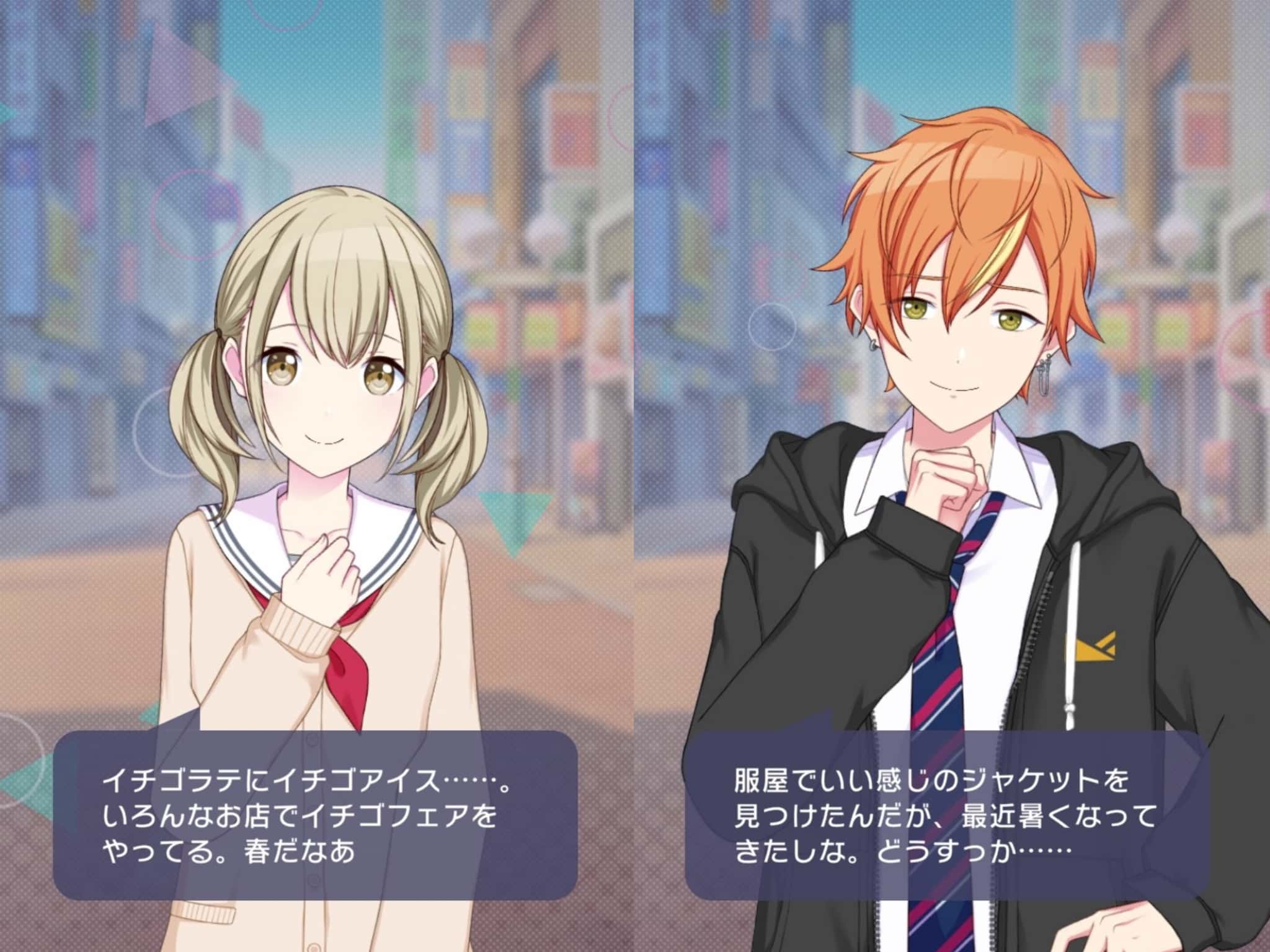 藍鼠 @ainz_fav 3日前 そういえばイベストスキップしてエリア会話だけ見てきたんだけど、センター街の絵名+こはデートでは???って脳が混乱した 偶然会って、そのままふたりでお茶コースとかだいぶ仲良くないと無理じゃん このあと彰人くんと話すときお互いから「この前絵名さんと(小豆沢さんと)お茶した」って話題でるし、彰こは世界線の彰人くんはなんか複雑な気持ちになってほしい センター街は進級前後で彰こは会話多めで好きです