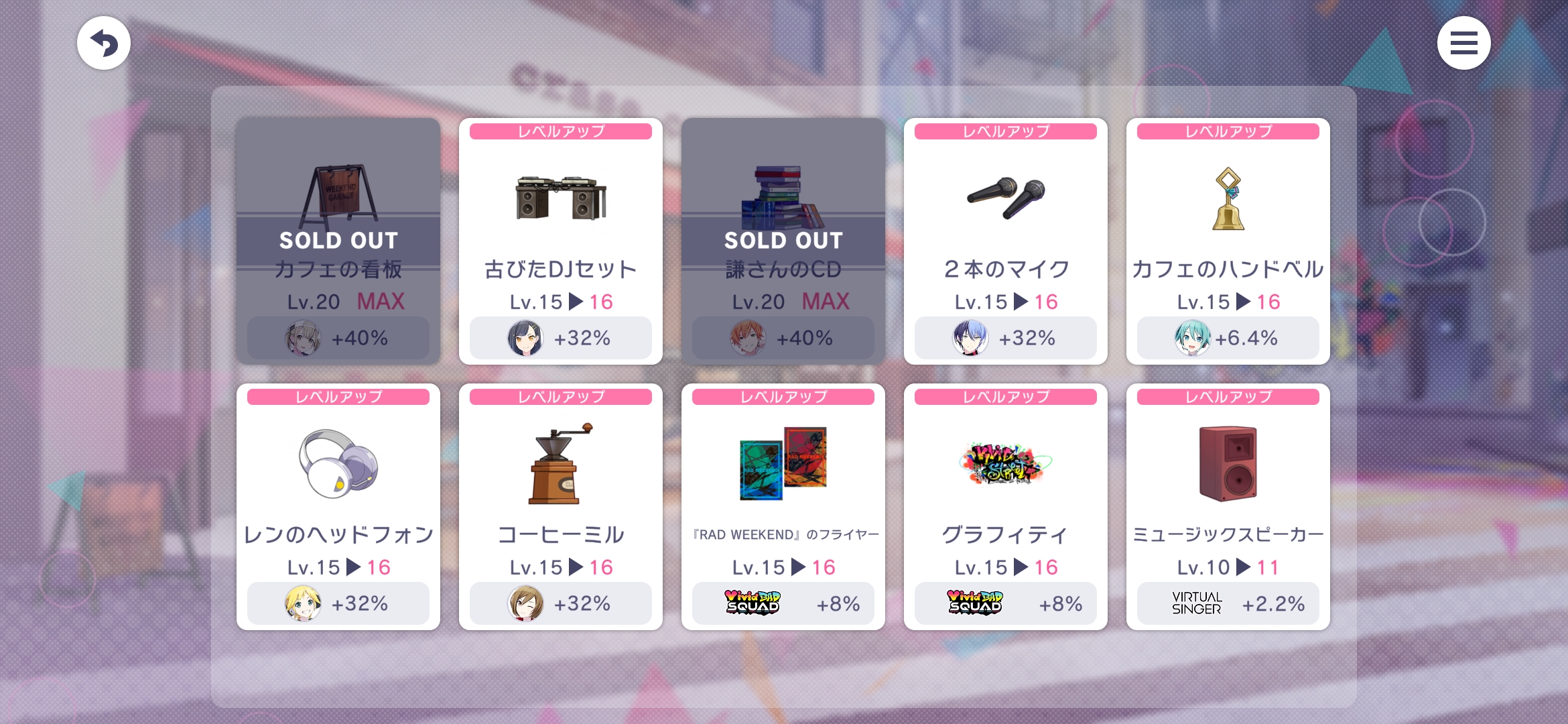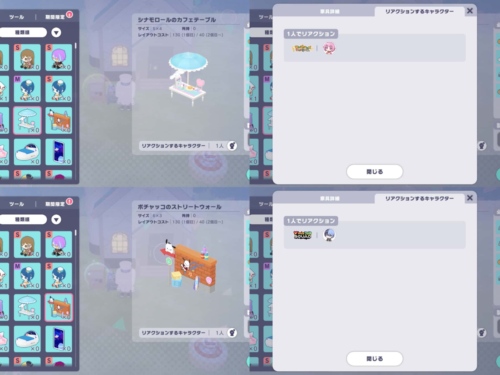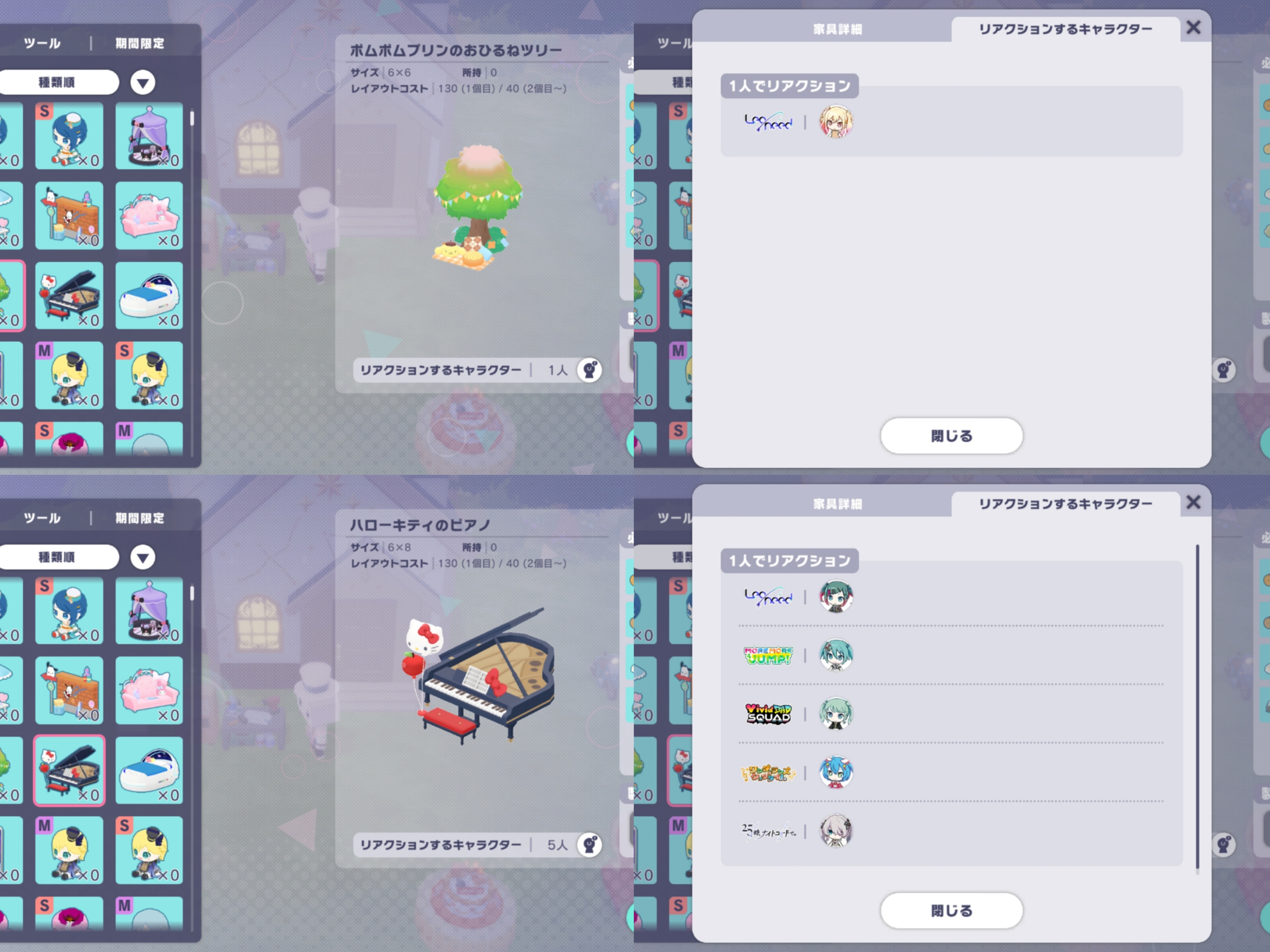 藍鼠 @ainz_fav 23日前 #マイセカ #サンリオコラボ 25曲クリア達成してきた これオート可だったけど、一曲ずつ選び直すのは逆に面倒だったから手動 なんかポチャッコ壁だけ家具の分類違わない?w ソファ(マイメロ)、クッション(クロミ)、カフェテーブル(シナモロール)、ピアノ(キティちゃん)ときて壁。特訓後イラストが屋外だからだろうけどどうやっていい感じに設置するんだろな。モデルルーム見たい