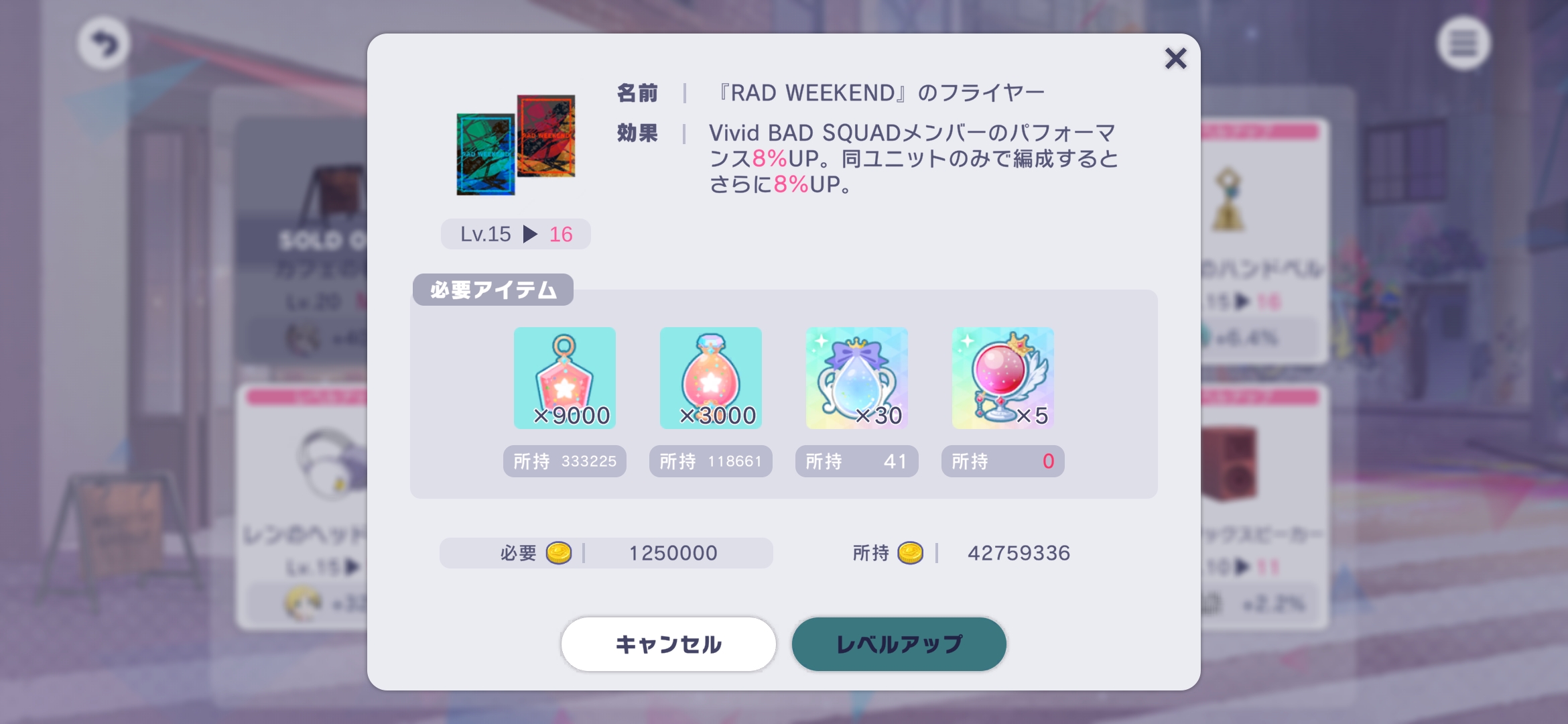 藍鼠 @ainz_fav 21日前 彰こはオブジェクトだけMAXにしてきたぞー 意外と雫足りてた。次はユニットの上げようかなって思ったけど1上げるのに雫3倍はちょっと出せないかな… ビビバスだけレベル15、他ユニとバチャのはレベル10止まりでこれだからもう無理すね
