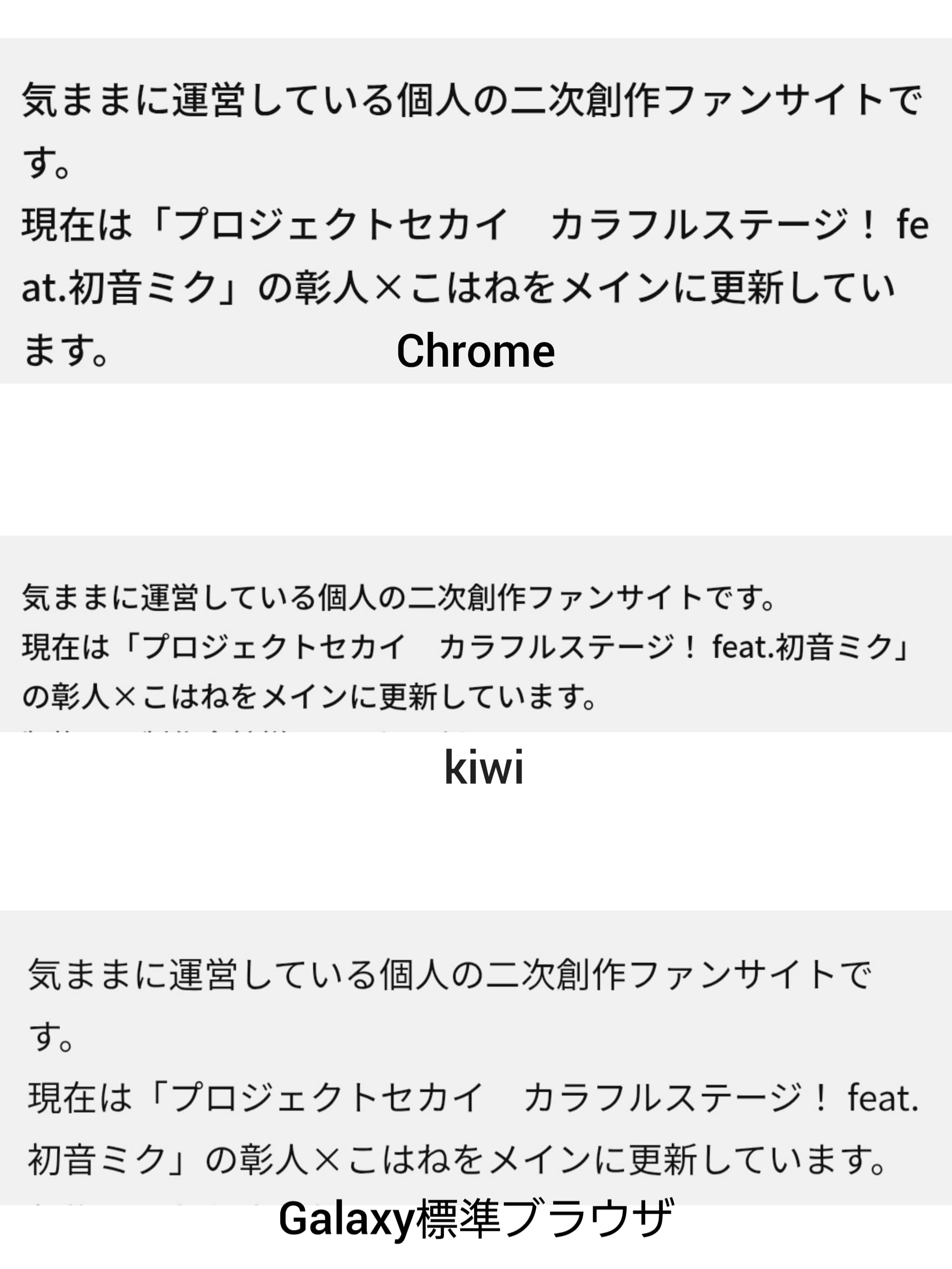 藍鼠 @ainz_fav 27日前 私がデフォルトで使ってるkiwiはChrome+αみたいなものと思ってたけど、だいぶ見え方が違う Chromeで開いたら文字でかくてびっくりしたw 私としてはkiwiの見え方をしててほしい&そのつもりで文字の大きさとか設定してたよ。Galaxy標準のやつも良い感じだと思う